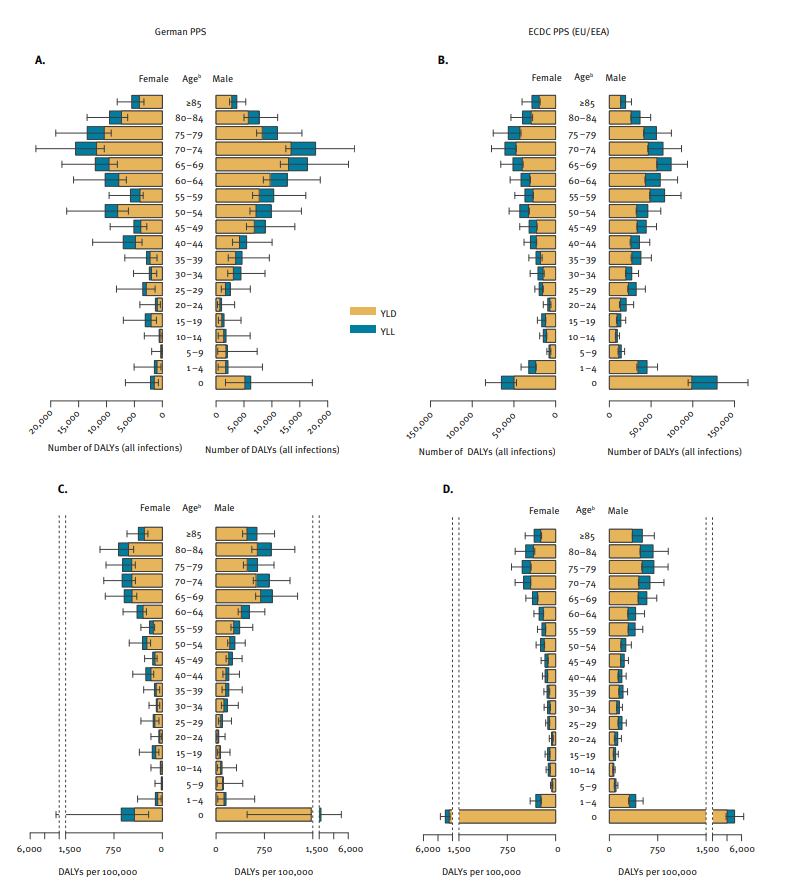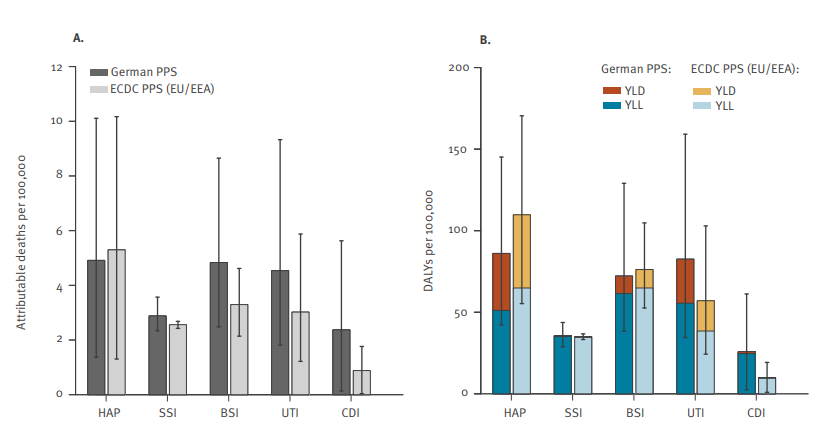 As shown in Figure 2, while Germany had a lower infection rate inside hospitals than the European Union average, its overall population burden was higher — 308 DALYs per 100 000 people, compared with 290 DALYs per 100 000 across the EU/EEA. This indicates that Germany experiences a high burden.