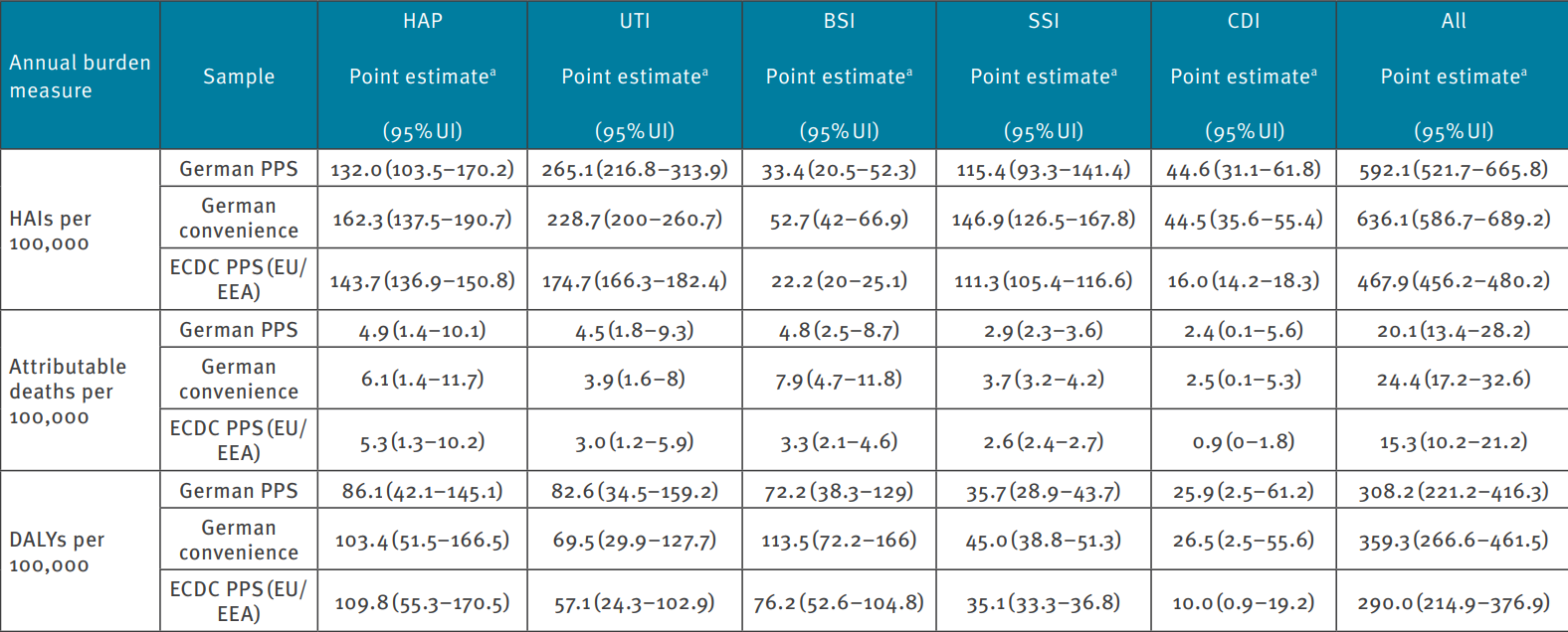 Using BHAI, the team estimated about 478,200 HAI cases in Germany in a single year — leading to 16,200 attributable deaths and a total of 248,900 disability-adjusted life years (DALYs).