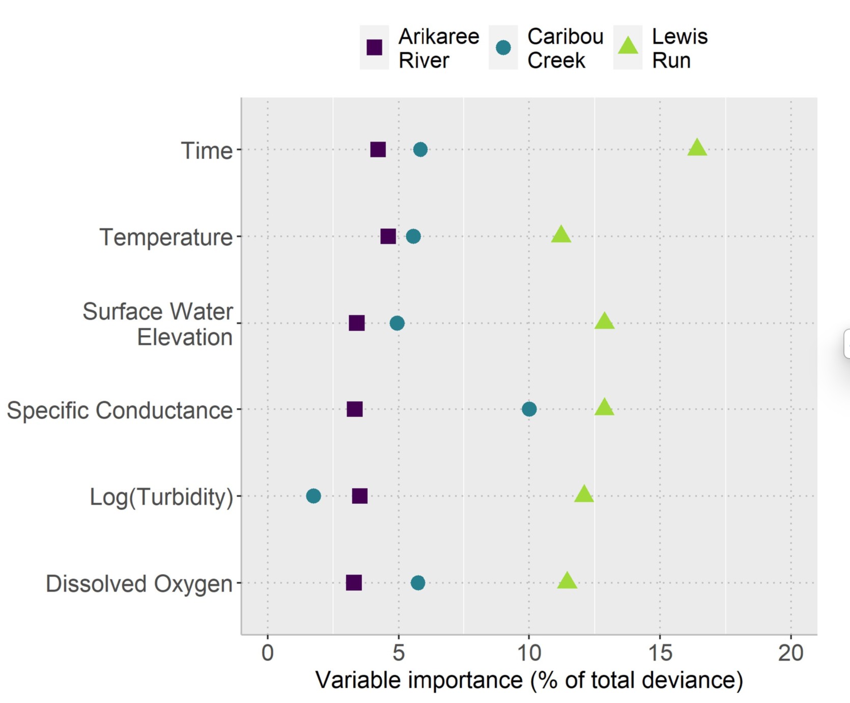 While the same set of variables was significant at each location, their relative importance changed, highlighting the need for site-specific calibration. For example, Figure 1 shows that Specific Conductance was a powerful predictor at the temperate Lewis Run site, while Temperature was more dominant at the semi-arid Arikaree River.